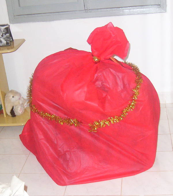 Se “auto presentear” embalada num saco do “Papai Noel” gigante para fazer surpresa para filha que estava a quase 1.000 km de distância de casa.